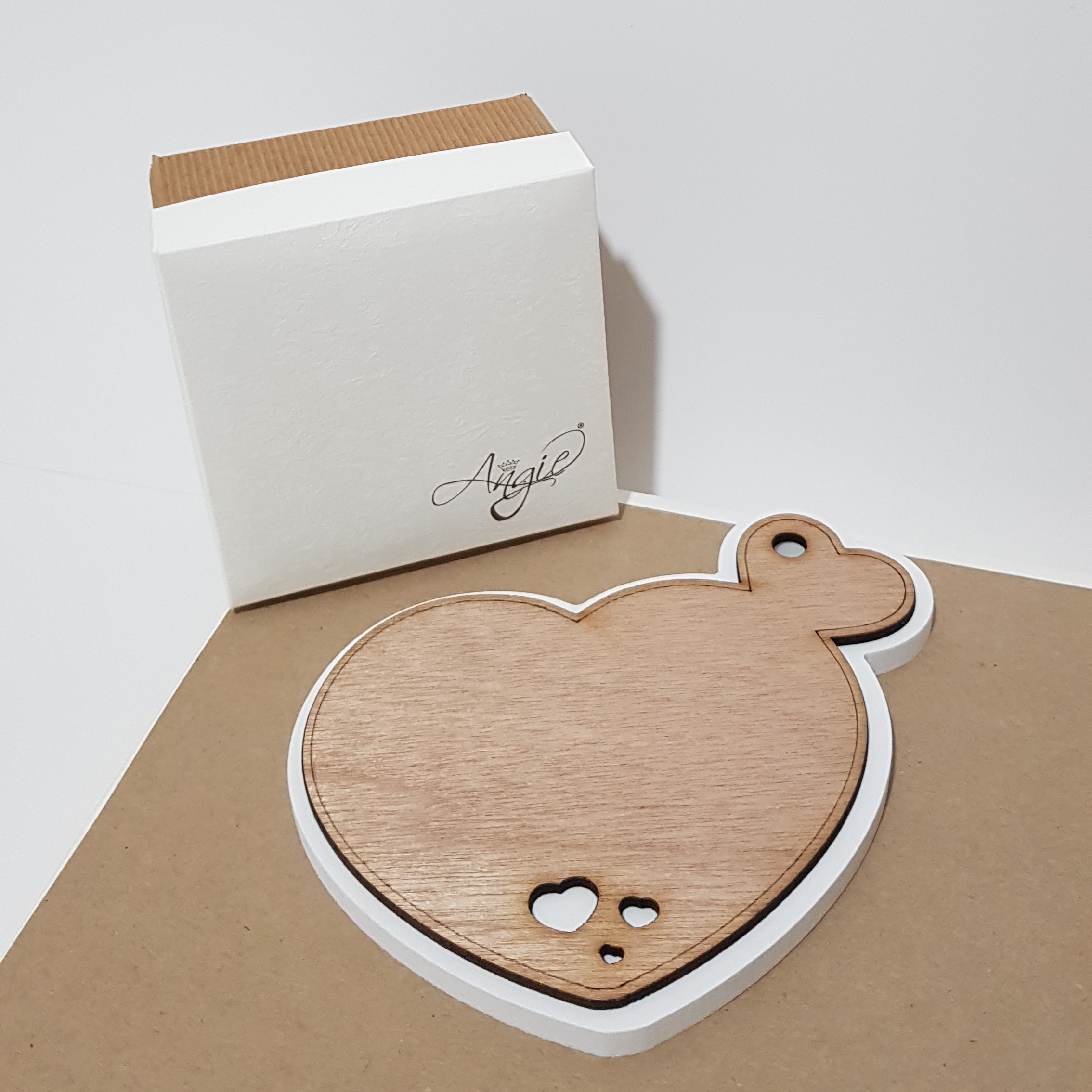 Tagliere a forma di cuore decorato in superficie con sagoma di cuore in legno. Bomboniera completa di confezione e partecipazione. Articolo oltre che utilitario ideale anche da esporre in cucina come oggetto di ornamento. Completo di astuccio
